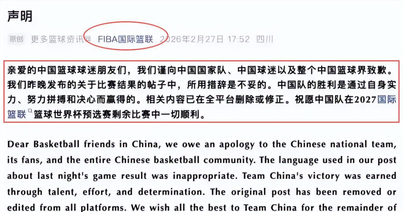 迫于强大舆论压力,FIBA于2月27日紧急发布中英文双语致歉声明,承认用语严重失当,肯定中国队技战术表现与顽强意志,并悄然撤下原帖、替换为修正后文案。